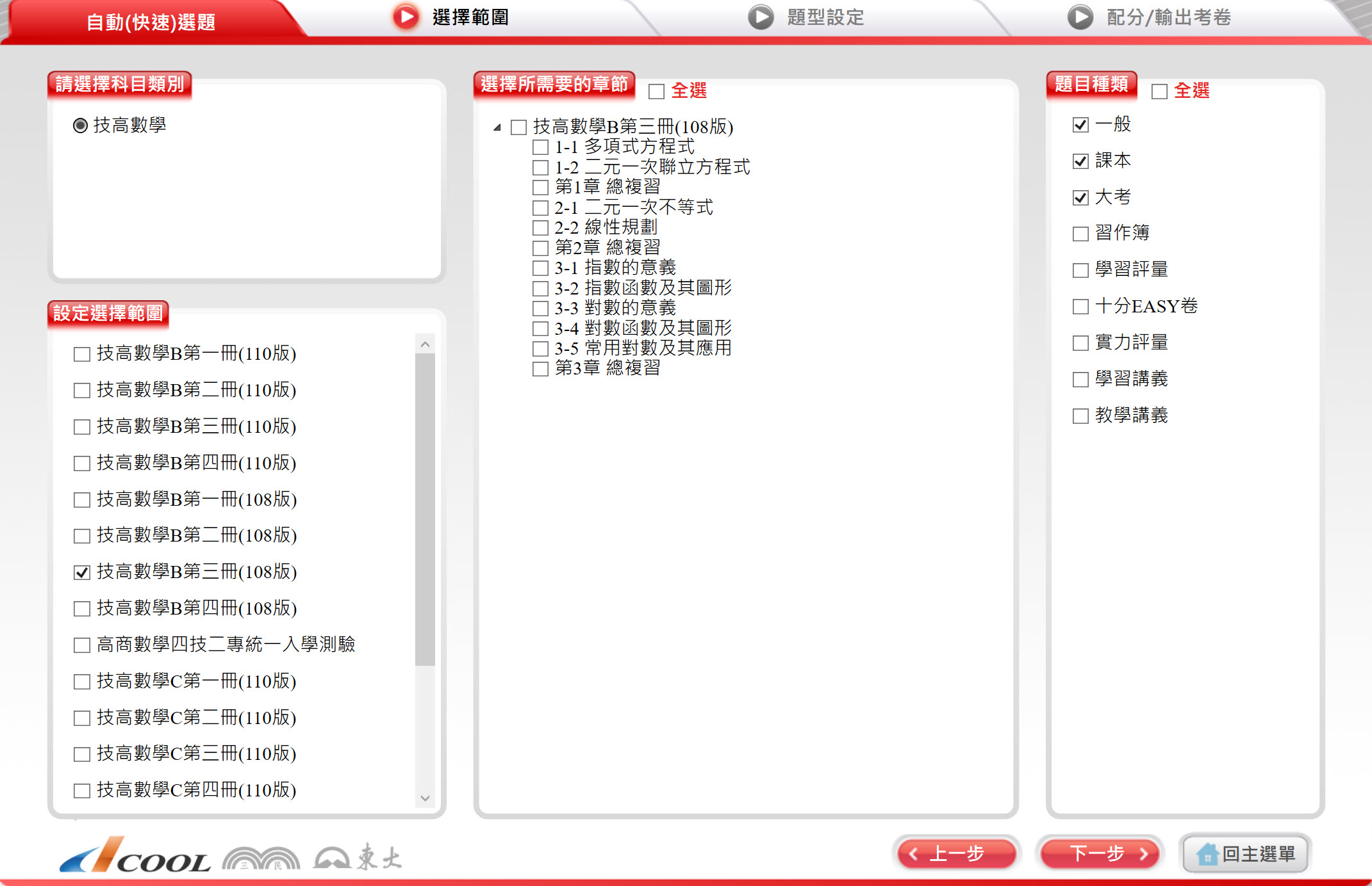 112學年上學期 技術高中命題光碟 三民東大版 數學科(B版、C版 1-4冊)(108課綱) 題庫光碟